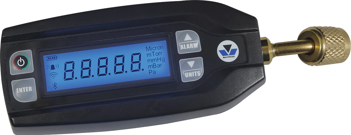 Cod 98063-BT KARAKTERISTIKE: Ulazni filter od sinterovane bronze za zaštitu senzora 5-cifreni LCD ekran ima ultra živopisno plavo pozadinsko osvetljenje koje omogućava laku čitljivost Senzor otporan na kemikalije za lakše čišćenje Ikona slabe baterije prikazana na LCD-u označava da su baterije prazne i da ih je potrebno zamijeniti Kalibracija se može izvršiti u poljskom okruženju Audio i vizuelni alarm kada vakuum padne ispod podešene vrednosti koju može podesiti korisnik Bluetooth® bežična tehnologija omogućava komunikaciju s ručnim pametnim uređajima putem aplikacije Mastercool Connect SPECIFIKACIJE: Senzor: termistor sa staklenim perlama sa temperaturnom kompenzacijom Priključak: 1/4 SAE F-FL sa depresorom vretena Radna temperatura: 32 do 120°F (0 do 45°C) Vakuumske jedinice: Micron, Torr, mTorr, mmHg, mBar, Pa Raspon: 20.000 do 1 mikron Preciznost: ±10% očitavanja (od 10.000 do 100 mikrona) Probni pritisak: 450 psi Automatsko isključivanje: Automatsko nakon 10 minuta, plavo pozadinsko osvjetljenje nakon 3 minute Napajanje: 2 AA baterije uključene Trajanje baterije: 100+ kontinuiranih sati (ovisno o korištenju pozadinskog osvjetljenja) Težina: 0,3 lb (0,13 kg) bez baterija / 0,5 lb (0,23 kg) sa baterijama Dimenzije: 1,9” x 6,3” x 1,4” (50 mm x 160 mm x 36 mm) Specifikacije za Bluetooth® bežičnu tehnologiju: 260' (80m) maksimalni domet linije vidljivosti Bluetooth® 4.2 i 5